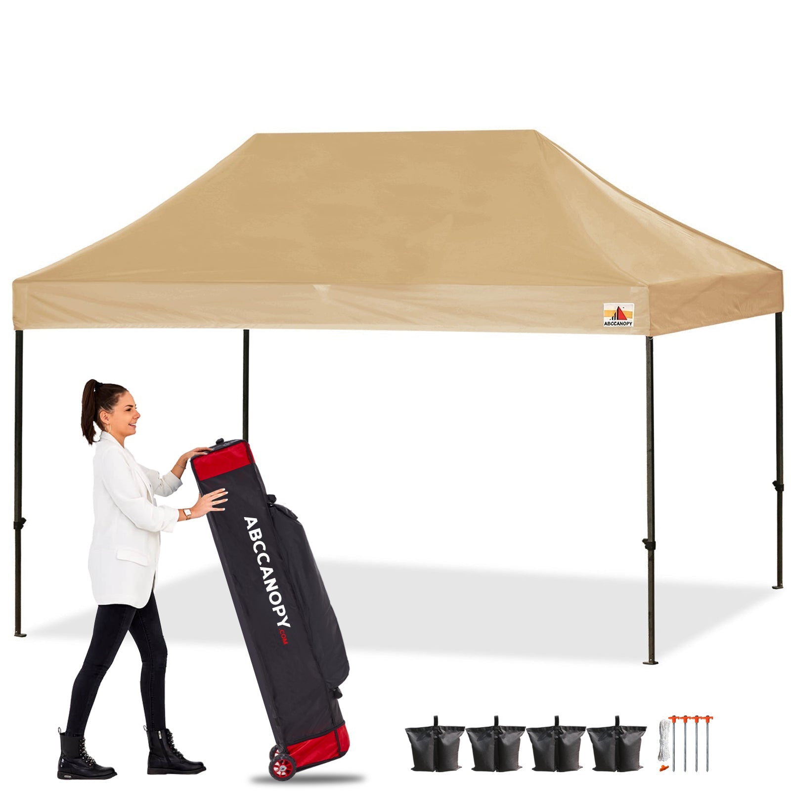 Package Includes (10x10/10x15) 1x Steel Frame, 1x Canopy Top, 1x Wheeled Bag, 4x Sand Bags, 4x Rope & Stakes
